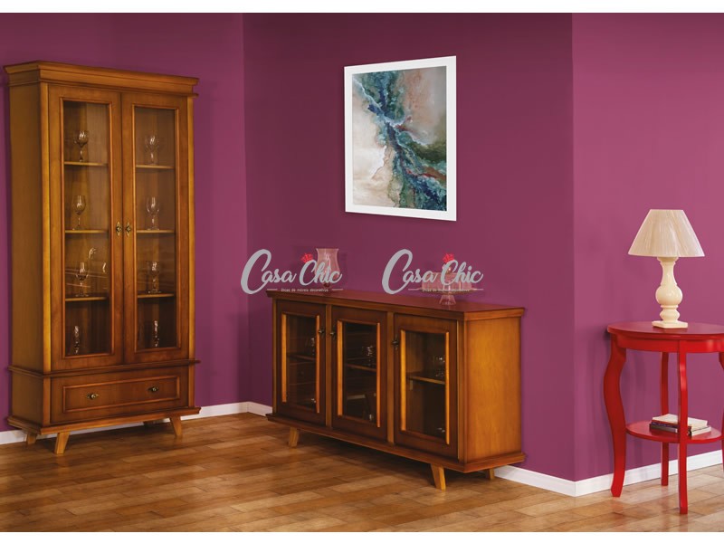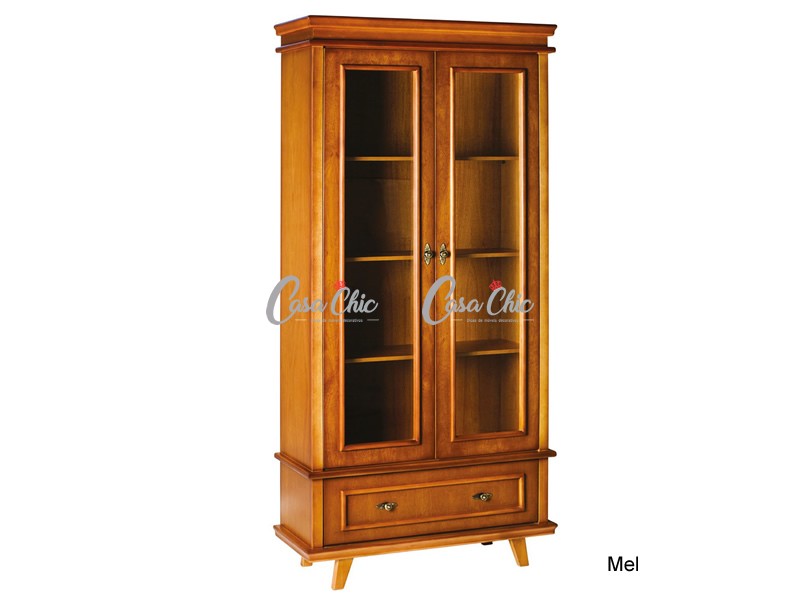 Possui 02 portas em vidro, com puxadores em ouro envelhecido